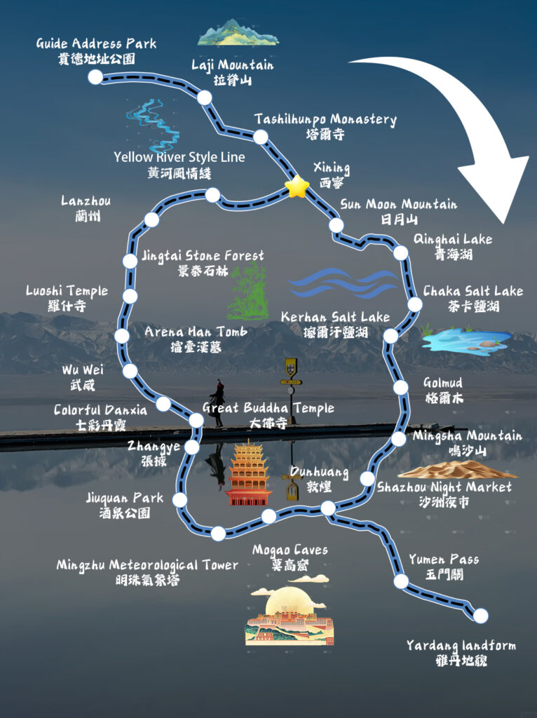 Set off from Xining to visit Ta’er Monastery, then head to Qinghai Lake and Chaka Salt Lake. Traverse Golmud to reach Dunhuang, explore Mingsha Mountain and the Mogao Grottoes, then continue to Jiayuguan Pass and Zhangye Danxia National Geopark (Colorful Danxia). Travel to Leitai Han Tomb in Wuwei and the Yellow River scenic belt in Lanzhou, before finally returning to Xining to round off the trip—along the way, you’ll feast your eyes on the spectacular wonders of lakes, salt lakes, grottoes and Danxia landforms.