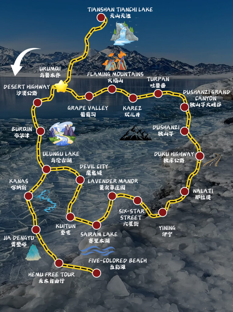 Set off from Urumqi to explore Heavenly Lake of Tianshan, then traverse the S21 Desert Highway to reach Ulungur Lake. Unlock the charms of Kanas, Hemu and Colorful Beach, visit Ghost City, Sayram Lake and Nalati Grassland; continue along the Duku Highway to explore Duku Grand Canyon and the Karez Wells in Turpan, before finally heading back—along the way, you’ll feast your eyes on the stunning lake views, grasslands, deserts and cultural hidden gems of Xinjiang.