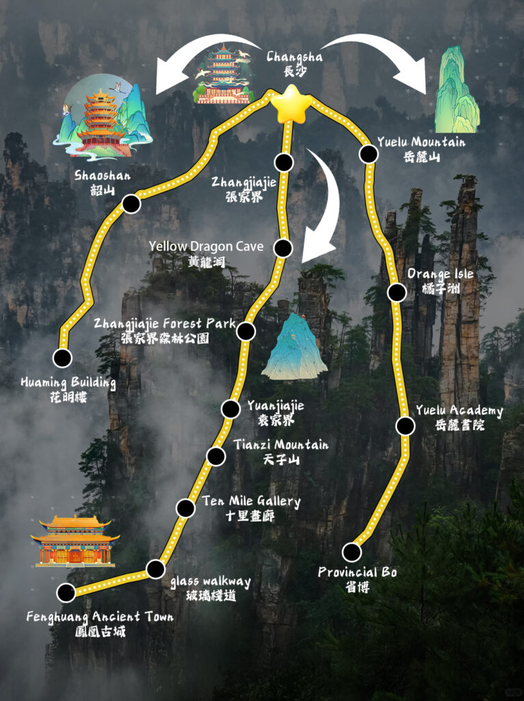 This journey unfolds at a leisurely pace, blending natural wonders with cultural heritage: start with exploring Yuelu Mountain, Orange Isle and Hunan Provincial Museum in Changsha, then head to Shaoshan to pay homage to the great man, followed by an adventure to Huanglong Cave, Zhangjiajie National Forest Park and Tianmen Mountain (with a walk on the glass plank road) in Zhangjiajie, and finally wind down in the idyllic Fenghuang Ancient Town to round off the trip.