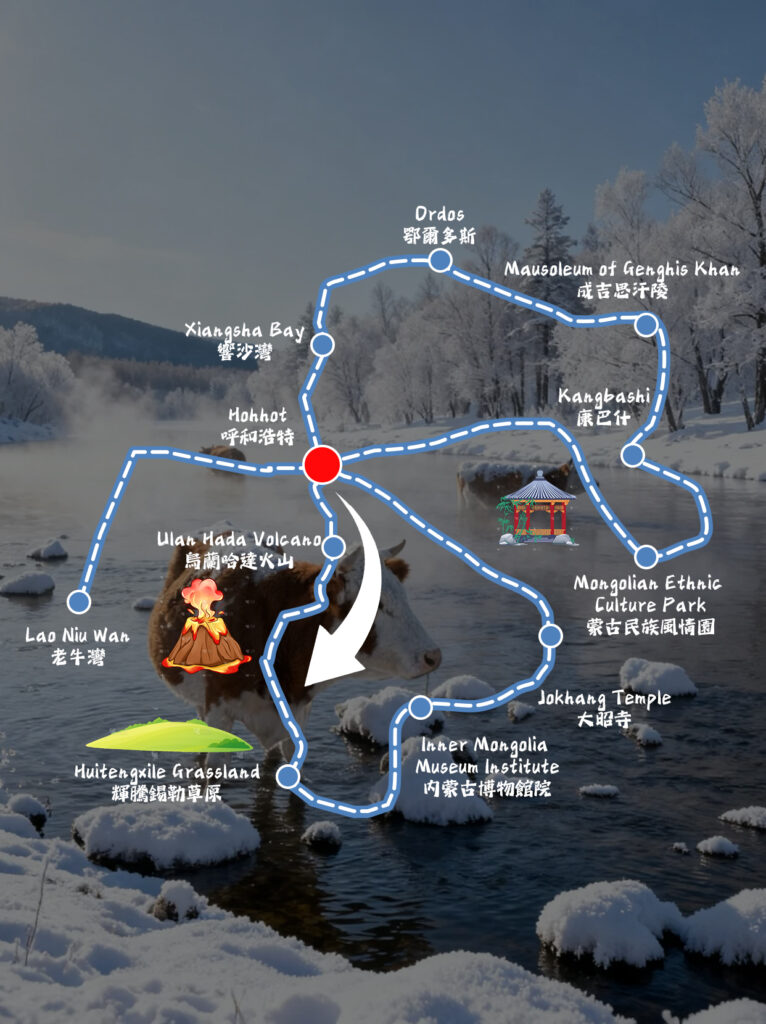 This is a 7-day themed tour of Hohhot and Ordos in Inner Mongolia, integrating natural landscapes, cultural heritage, and ethnic customs. Upon arrival in Hohhot from your departure city, you will first explore the geological wonders of Wulan Hada Volcanoes, then wander through Huitengxile Grassland to immerse yourself in the pastoral scenery. Next, visit cultural landmarks such as Inner Mongolia Museum and Dazhao Temple, and discover the stunning Yellow River Gorge at Laoniuwan. Afterwards, travel to Ordos to experience Xiangshawan Desert, visit Genghis Khan Mausoleum and Kangbashi Ethnic Culture Park, and engage in an immersive experience of Mongolian-Yuan culture. Finally, return from Hohhot. This itinerary balances natural adventures with cultural experiences, featuring a relaxed pace perfect for a leisure tour.