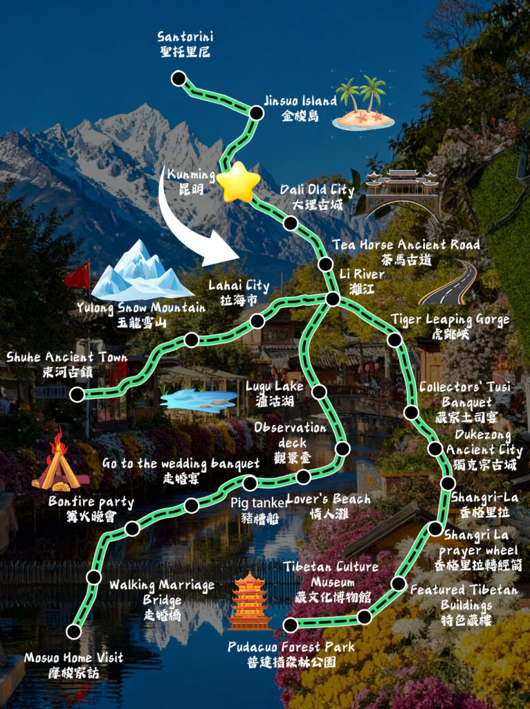blow the evening breeze from the ancient city of Dali, listen to the waves at the Tiger Leaping Gorge, plunge into the blue water of Lugu Lake, and finally step on the clouds of Yulong Snow Mountain — wrap all the lakes, ancient cities and snow mountains in Yunnan on this journey. Even the fireworks from Lishui Sands didn’t fall