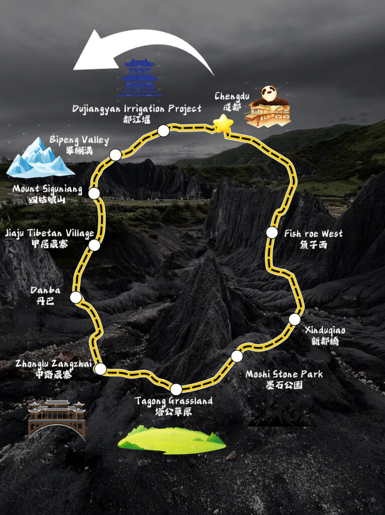 From the thousand years of water conservancy in Dujiangyan, breaking into the snow color of Bipenggou, chasing the clouds of Siguniang MountainFrom the millennium-old water conservancy project of Dujiangyan, we step into the snowy landscapes of Bibengou, chase the clouds drifting over Siguniang Mountain, and dive into the winds sweeping through Tibetan villages and grasslands — weaving the elegance and vastness of Western Sichuan into this short journey., plunging into the wind of Tibetan villages and grasslands-rubbing the spiritual beauty and vastness of western Sichuan into this short trip.