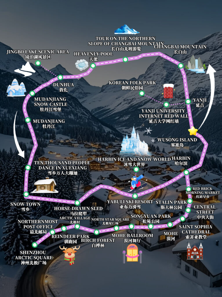 From the misty rime and Tianchi Lake of Changbai Mountain, we dive into the disco carnival of Snow Town, then step into the aurora borealis of Mohe — wrapping all the crispness, liveliness and far-north romance of Northeast China into this long winter dream.